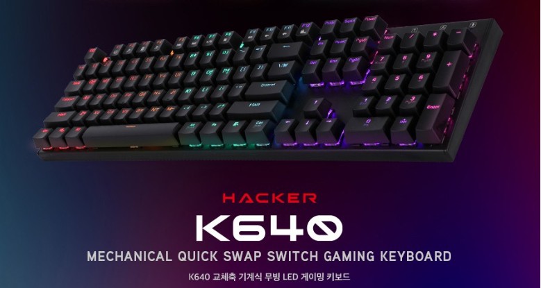 - 모델명 K640 갓성비 최강의 제품입니다. 나만의 1인 게이민 공간을 원하셨다면 k640으로 시작해 보세요! 새로운 무빙 LED로 화려한 연출과 축교환이 가능한 K640은 빠른 키 응답속도와 무한 동시입력 지원으로 게이밍에 최적합한 키보드 입니다. PC방에서 사용하던 기계식 키보드를 이제 집에서 즐겨보세요! 승리를 부르는 대한민국 대표 게이밍 기어 전문 브랜드 HACKER는 강력한 성능과 세련된 다자인, 합리적인 가격으로 게이밍 기어를 제공합니다.